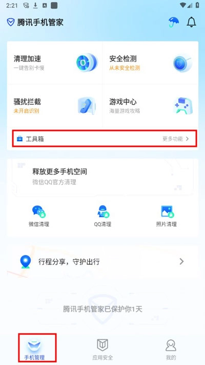 打开软件后,进入手机管理页面,找到并选择工具箱选项,接着点击更多功能按钮。