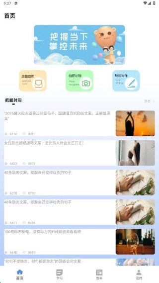 2、在学习页面,你不仅能浏览到丰富多样的满分作文素材,还可以开展单词学习活动。