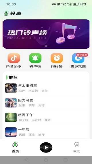 1、安装完成后,在首页就能看到推荐的铃声素材,此外还有抖音热歌、铃声榜、闹铃榜以及更多氛围类板块。