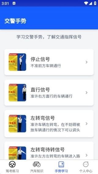 4、交警手势学习板块,能帮助大家熟悉各类交通指挥信号,整个学习过程十分便捷。