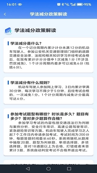 2、向我们展示了模拟考试、顺序练习、错题重做等功能,以及学法减分政策的解读。