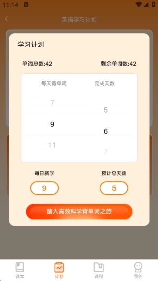 3、点击“立即定制学习计划”,接着选择“每日新学”和“预计总天数”,随后开展高效的单词学习与背诵;