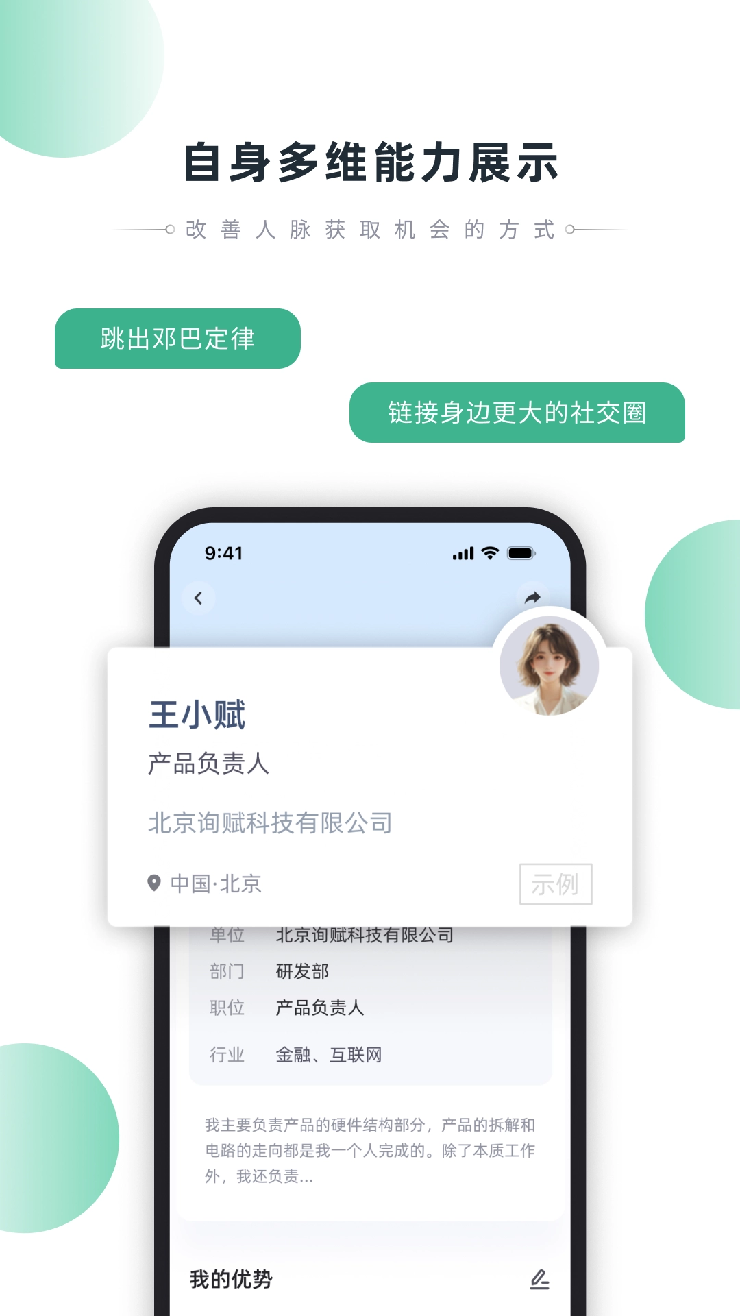 1、借助社交名片这一载体,从多维能力展示、产品呈现、合作渠道拓展等方面入手,以自身积累的更多好友人脉资源为依托,优化人脉获取的途径,从而提升自我价值。