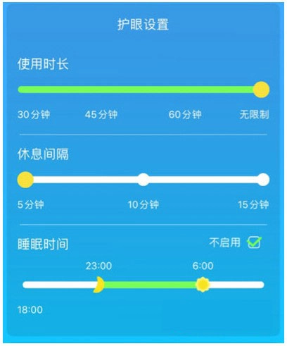 在设置页面里,能够设定休息间隔与睡眠时间,也可以进行护眼相关的设置。完成这些设置后,宝宝在规定的时间段内将无法收听故事,并且界面上也会显示出对应的提示信息。