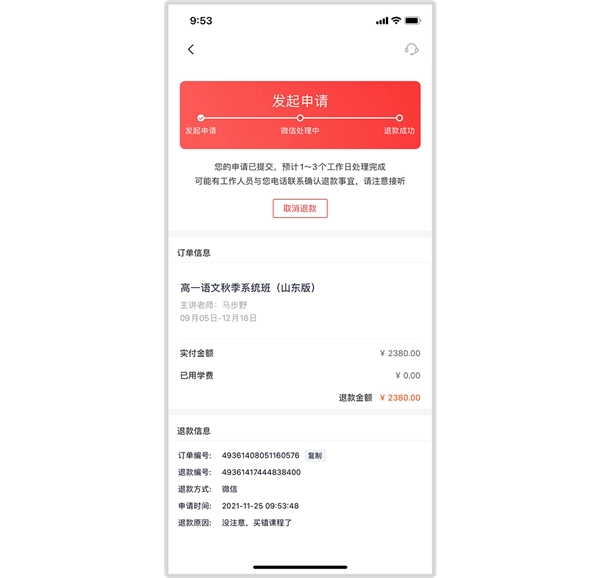 点击「申请退款」按钮,即可进行申请退款操作。