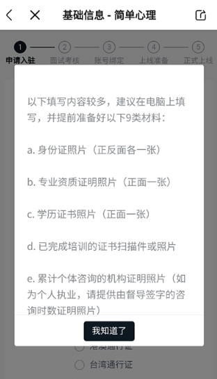 5、根据页面请用户填写个人的基础信息和准备资料和材料。资料需证明以下资质或胜任力: