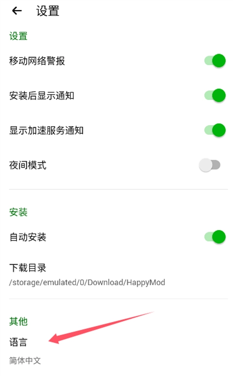 在设置页面的其他选项中,能看到语言功能下方显示着简体中文,点击此处即可进入语言切换添加页面。