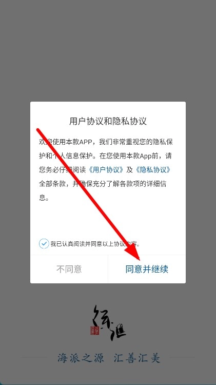 1、打开应用,在弹出的用户协议与隐私协议页面,点击“同意并继续”按钮。