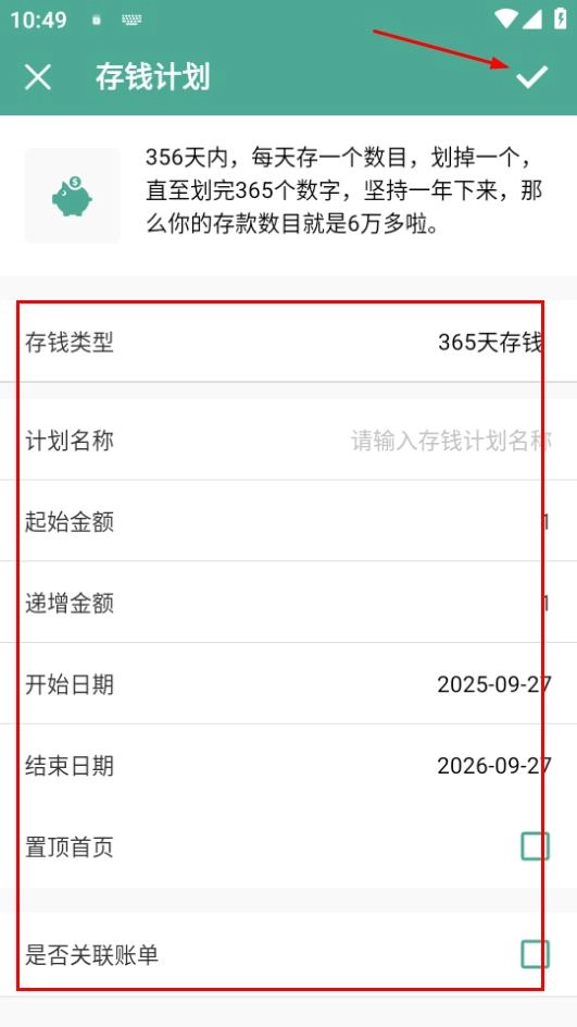 填写好相关信息后,点击页面右上角的对勾图标,就能完成存钱计划的设置了。