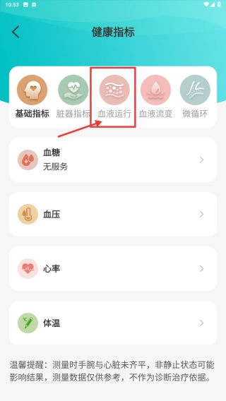 在健康指标页面,找到血液运行分类并点击,即可查看与之相关的各项指标。