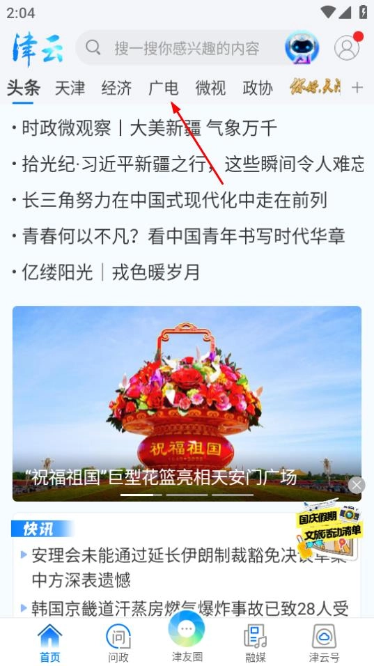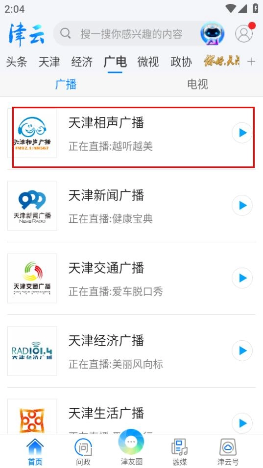 1、进入津云首页,若想听广播内容,点击广电选项。