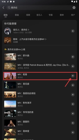 在搜索结果中找到目标MV稻香,点击播放该MV。