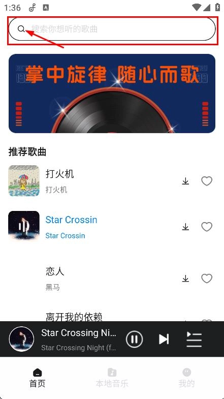 在应用首页,点击用于搜索想听歌曲的搜索框,即可进入搜索页面。
