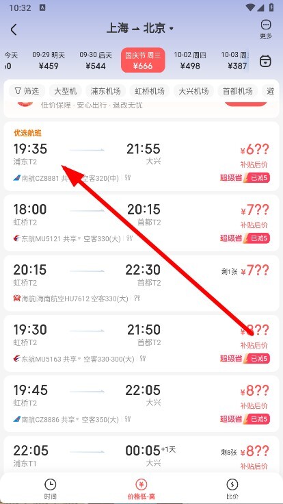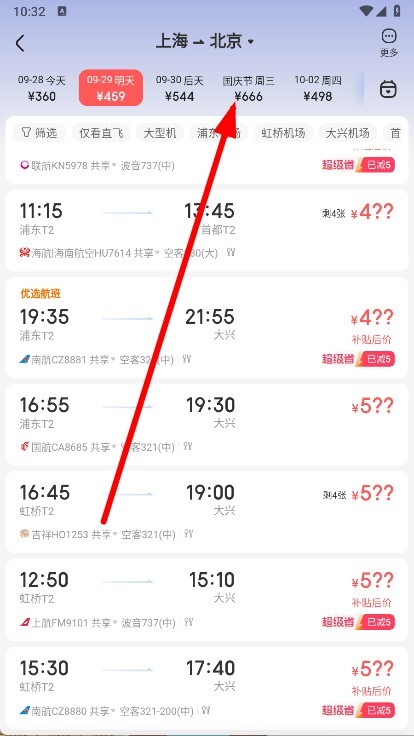 4、在对应日期的航班列表中,挑选心仪的航班。