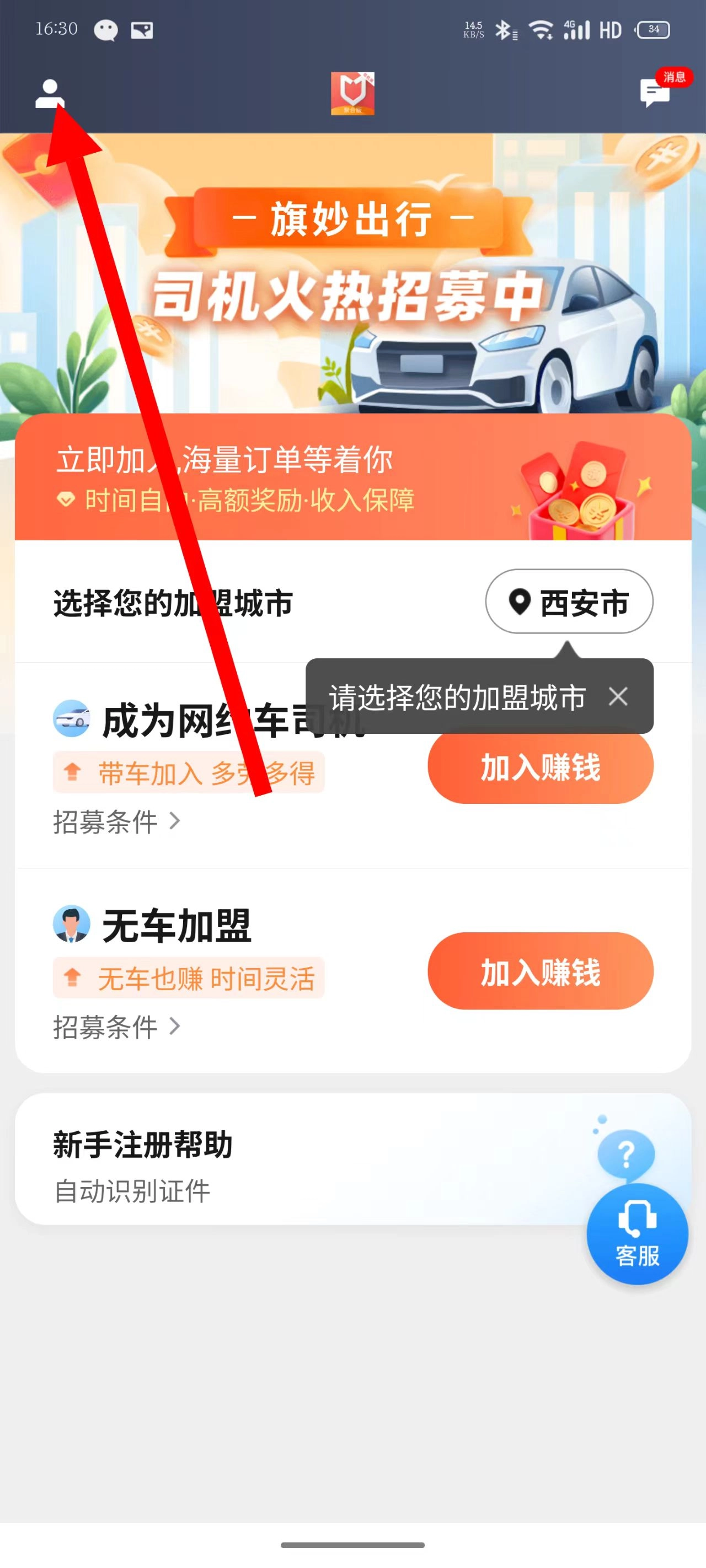 1、启动旗妙出行司机端聚合版应用,点击界面左上角的头像图标。