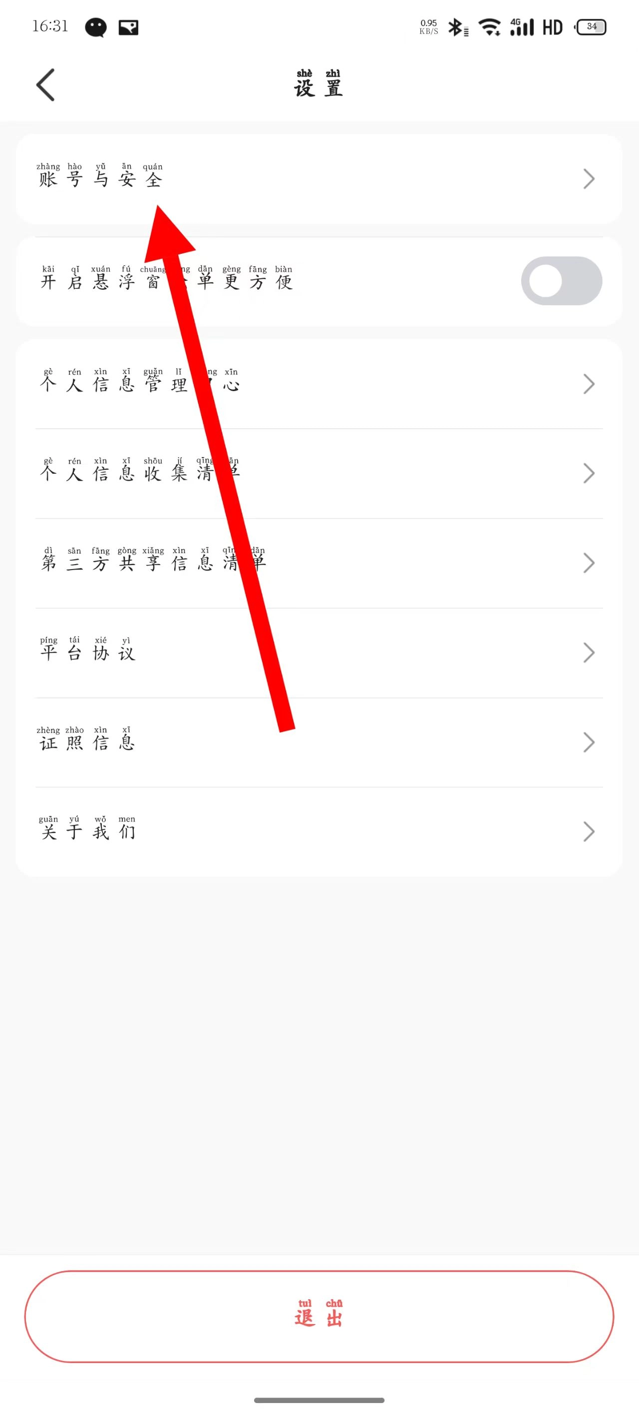 3、进入设置页面后,点击账号与安全。