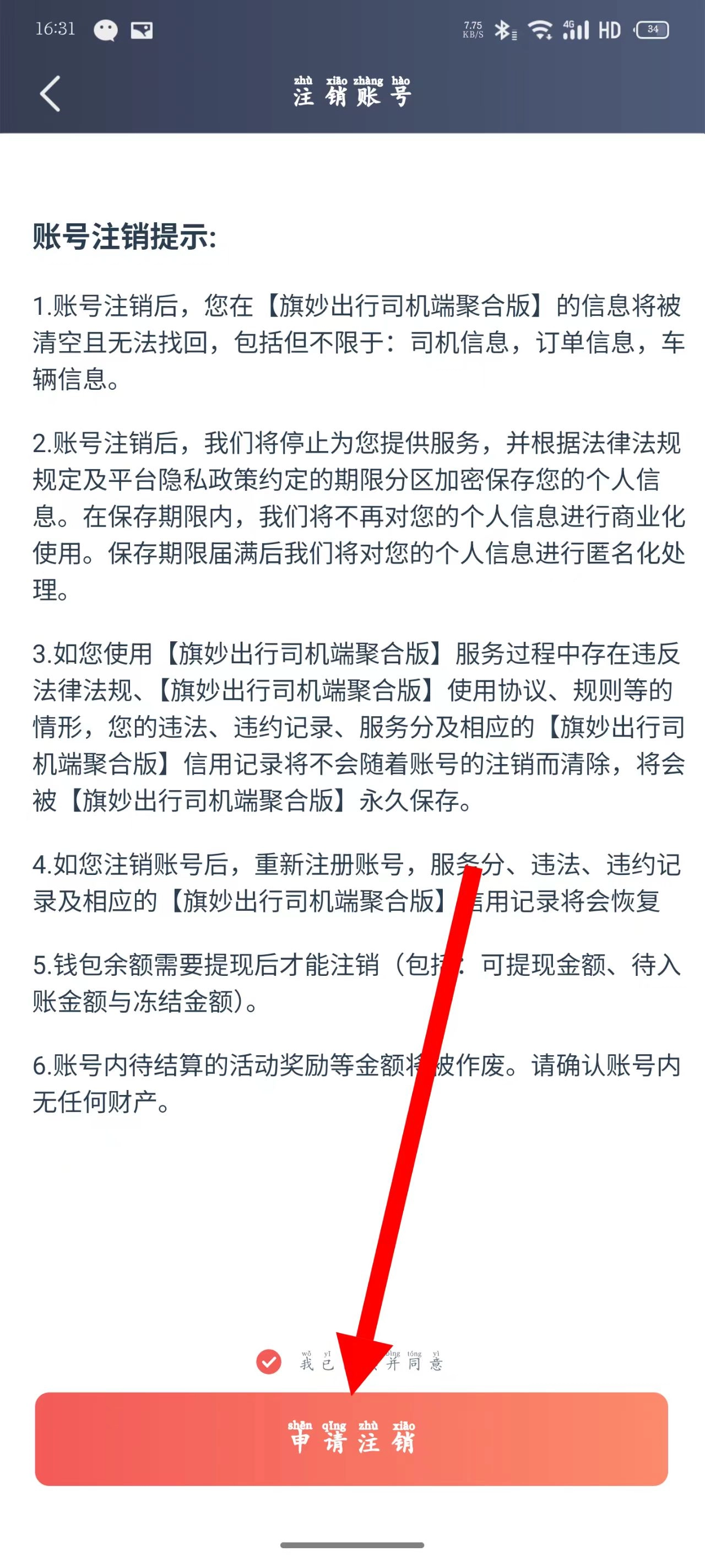 5、仔细阅读账号注销提示内容后,勾选同意相关条款,点击申请注销按钮,再依据提示完成后续的操作步骤。