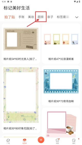 在贴纸分类页面,点击“厨房”标签,即可浏览厨房类贴纸的商品列表。