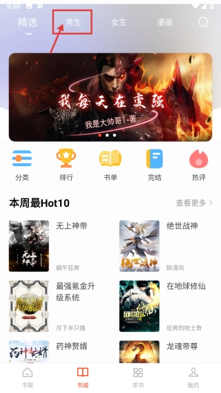 在书城页面,点击男生分类标签,即可进入男生分类小说列表页面。