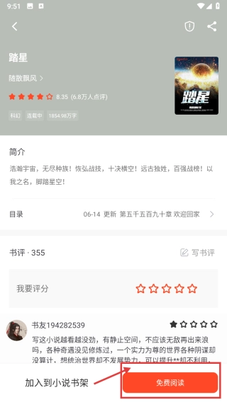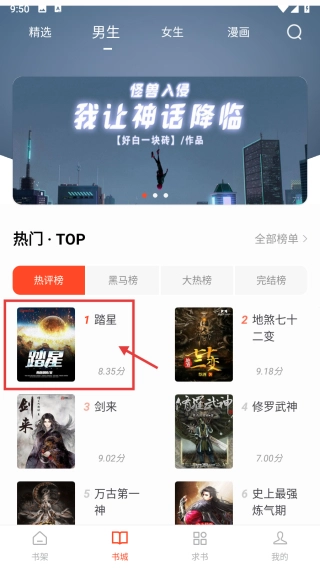 在男生频道的分类小说列表页,找到《踏星》这部小说并点击,即可进入其详情页面。