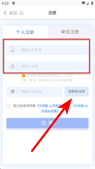 4、在注册页面,依次输入手机号和密码后,点击“获取验证码”按钮。
