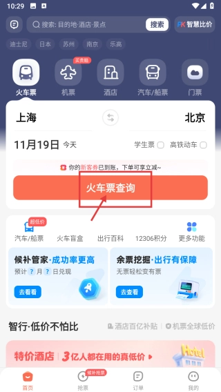 打开出行类应用,点击火车票查询按钮,进入票务查询页面。