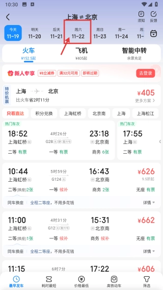 在票务查询页面,选择11月22日的日期选项,即可切换至该日期对应的票务信息页面。