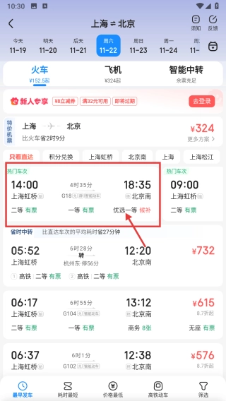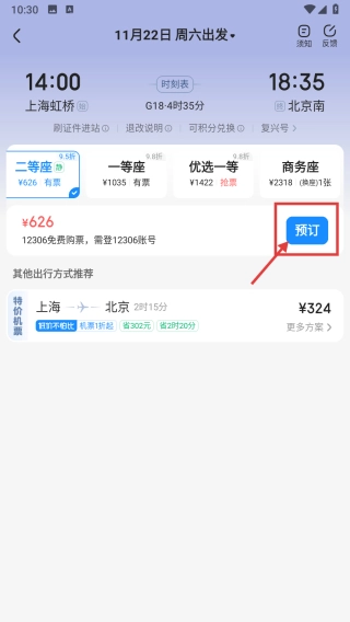 在11月22日的票务信息中,找到14:00从上海虹桥开往北京南的G18次列车选项,点击进入该车次的详情页面。