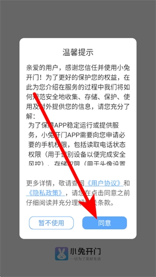 打开小兔开门,在温馨提示弹窗中,点击同意。