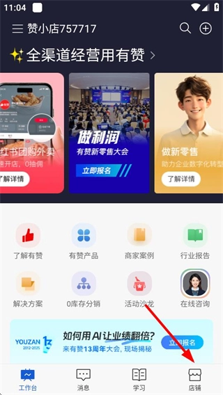 1、在有赞微商城首页,点击右下角店铺选项,进入店铺页面。