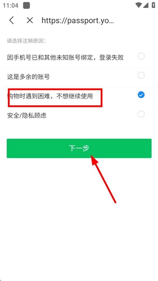5、在注销原因选择页面,选择注销原因后点击下一步,进入注销确认页面。