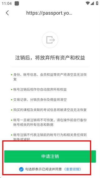 4、在注销提示页面,勾选协议后点击申请注销,进入注销原因选择页面。