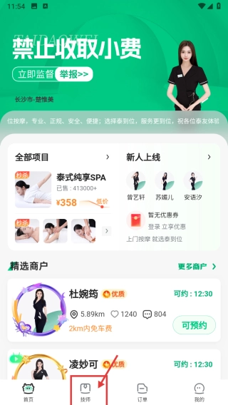 打开上门服务类应用后,点击界面底部的“技师”选项,即可进入技师列表页面。