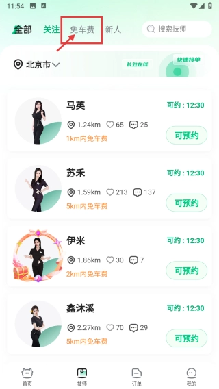 在技师页面,点击“免车费”分类标签,即可筛选出提供免车费服务的技师。