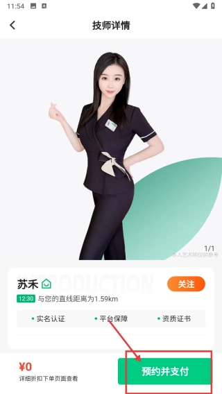 在技师详情页面,点击“预约并支付”按钮,即可完成服务预约的相关操作。