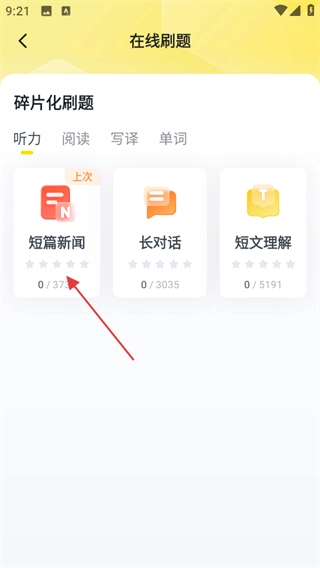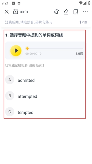 在练习页面,你就能开启短篇新闻精准辨音的碎片化练习并进行题目作答。