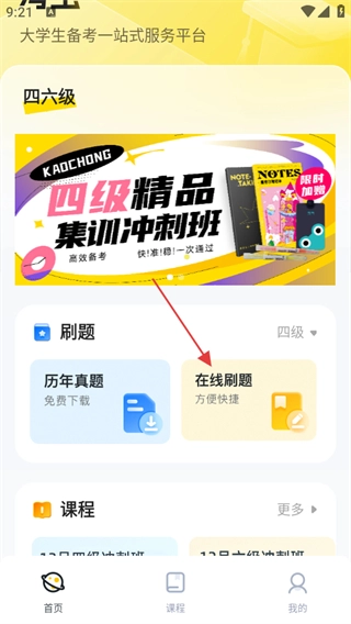 你可以在考虫首页找到在线刷题选项,点击它就能进入在线刷题页面。