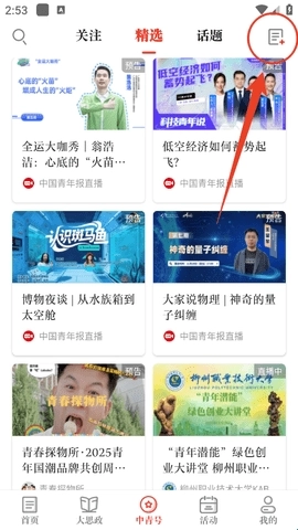 1、若要发布文章,需先进入“中青号”版块,进入该版块后,点击右上角的发布按钮即可。