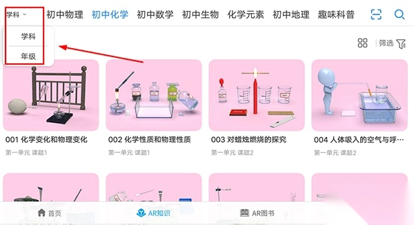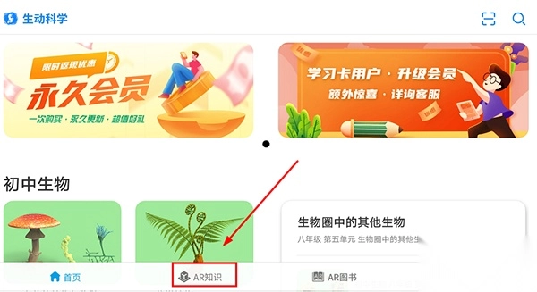 打开生动科学AR应用后,在界面下方找到“AR知识”选项并点击,即可开启相关学习内容。