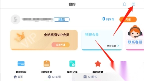 打开生动科学应用后,先找到界面右下角的“我的”选项并点击,接着再点击页面右上方的齿轮形状图标。
