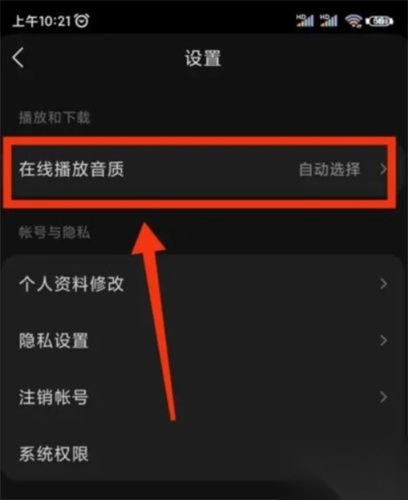 在设置页面,找到“在线播放音质”选项并点击,就能对音质进行调整,可选的音质级别包括标准、较高、极高和无损这几种。
