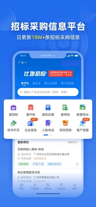 比地招标网旗下的移动端应用“比地招标”(原名为“标讯快车”),是一个专注于招投标信息服务的平台。平台提供招标信息、在建项目、工程项目等各类招标采购相关信息,并能依据企业资质为用户定制匹配的项目信息,帮助企业减少筛选项目的时间,提升工作效率,成为企业开展招标采购工作的得力助手。