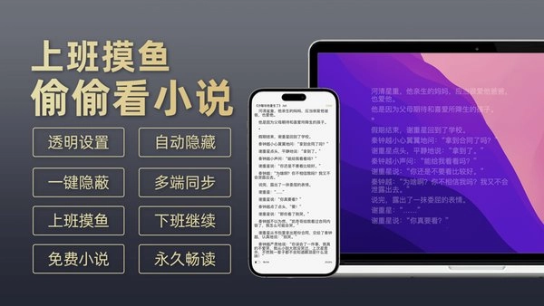 这是幽灵阅读器的手机端,我们是一款能同步电脑端的隐蔽看书刷题软件,阅读进度实时同步,上班时可以在电脑上偷偷看小说,或者利用它备考考证、考研刷题记单词,下班后还能继续接着读、接着背,进度始终保持同步。