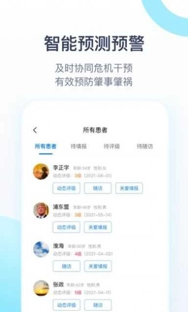 1、完成患者认领工作,同时开展患者动态评级、随访、关爱信息填报等相关内容,精准记录患者的情绪状态、行为表现等情况。