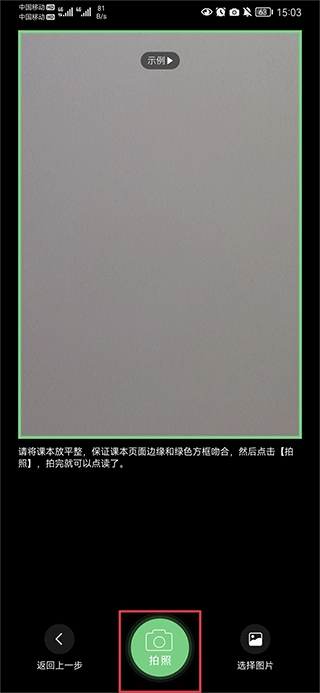 4、若里面没有你要的课本可以点击拍课本功能,然后将课本放平,保证课本页面边缘和绿色方框吻合,然后点击拍照就可以点读啦。