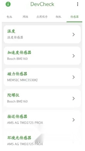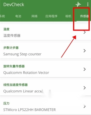 1. 首先,我们打开DevCheck,然后向右滑动,找到传感器界面。