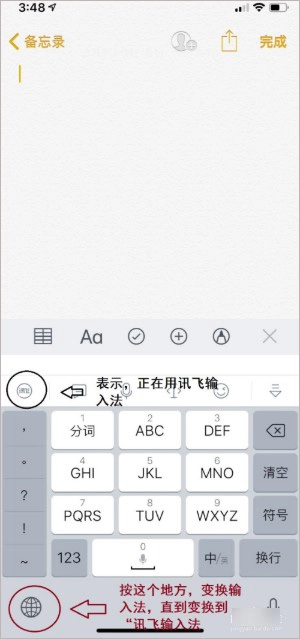 6、找到“备忘录”,接着新建一个空白页面,随后点击输入,再点击键盘下方的“小地球”来切换模式,切换至带有“讯飞”标志的输入法,这样就能使用啦,其输入方法和其他输入法并无差异,很容易就能掌握哦。