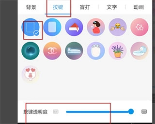 4、挑选心仪的背景后,设置其他选项。例如,按键方面,可设定一个自己较为喜欢的按钮,接着设置透明度。