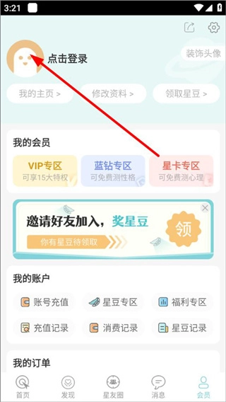 2、进入会员中心页面,用户可查看我的会员、我的账户(账号充值、消费记录等)、我的订单,点击头像登录。