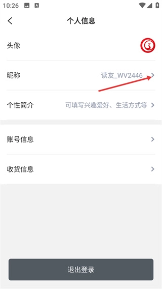 3、进入个人信息页面后,点击“昵称”这一选项,即可进入昵称设置页面。